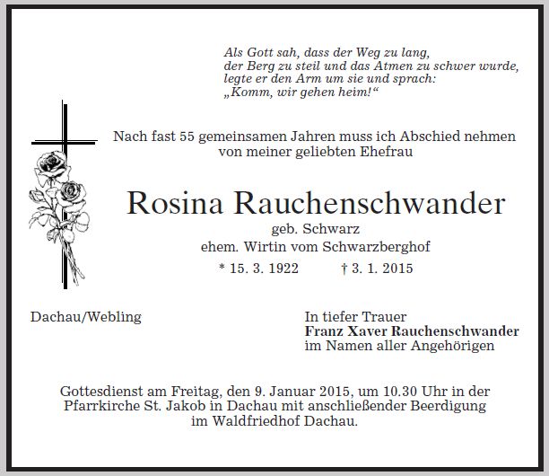 Wir trauern um Frau Rosina Rauchenschwander geb. Schwarz ehem. Wirtin vom Schwarzberghof * 15.03.1922 † 03.01.2015 |