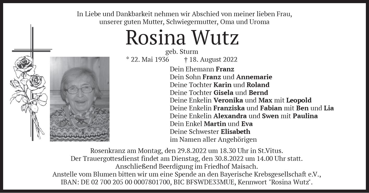 Rosenkranz am Montag, den 29.8.2022 um 18.30 Uhr in St.Vitus. Der Trauergottesdienst findet am Dienstag, den 30.8.2022 um 14.00 Uhr statt. Anschließend Beerdigung im Friedhof Maisach. Anstelle vom Blumen bitten wir um eine Spende an den Bayerische Krebsgesellschaft e.V.,