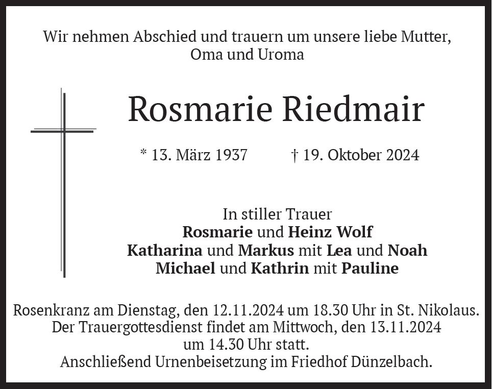 Wir trauern um Frau Rosa Maria Riedmair * 13.03.1937 † 19.10.2024 |