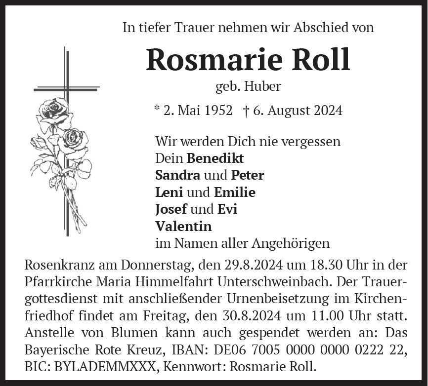 Wir trauern um Frau Rosmarie Roll geb. Huber * 02.05.1952 † 06.08.2024 |