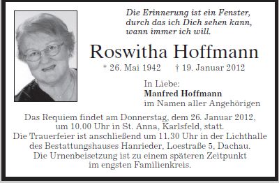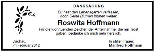 Wir trauern um Frau Roswita Hoffmann geb. Priglmeier Innenausstatterin * 26.05.1942 † 19.01.2012 |