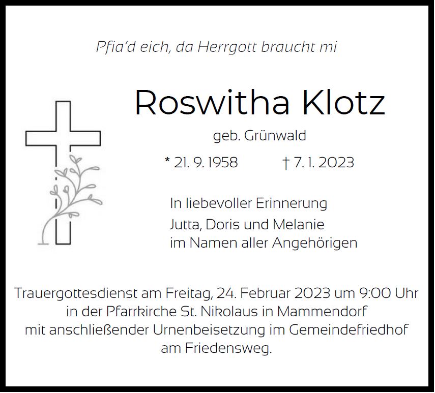 Gottesdienst am Freitag, dem 24. Februar 2023, um 09:00 Uhr in St. Nikolaus Mammendorf Beisetzung am Freitag, dem 24. Februar 2023, um 10:00 Uhr Friedhof am Friedensweg Mammendorf