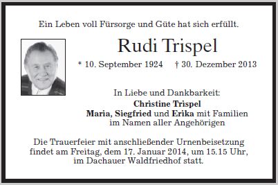 Trauerfeier am Freitag, dem 17. Januar 2014, um 15:15 Uhr im Dachauer Waldfriedhof mit anschließender Urnenbeisetzung.