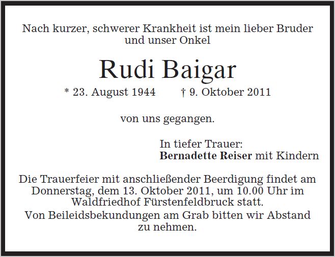 Die Trauerfeier mit anschließender Beerdigung ist am Donnerstag, dem 13.10.2011 um 10:00 Uhr im Waldfriedhof Fürstenfeldbruck. |