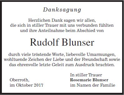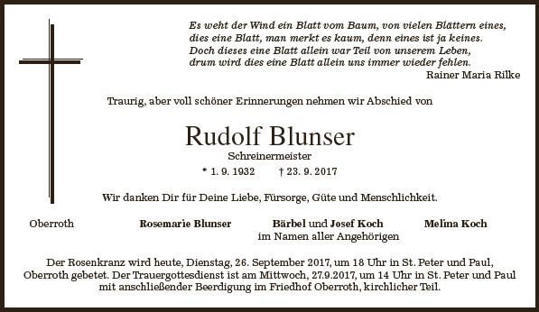Wir trauern um Herrn Rudolf Blunser Schreinermeister * 01.09.1932 † 23.09.2017 |