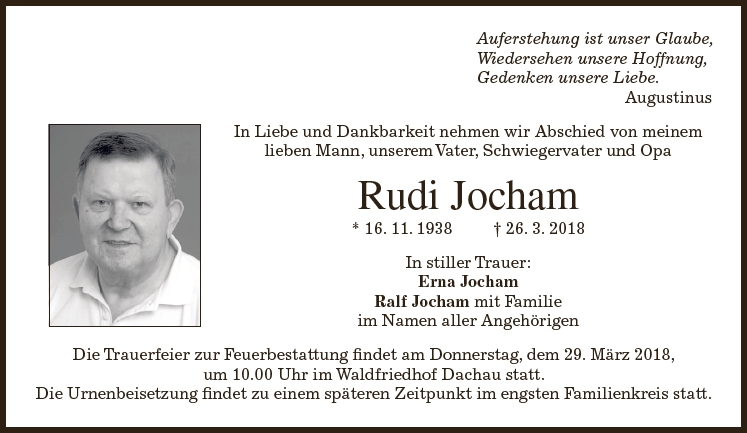 Trauerfeier zur Feuerbestattung am Donnerstag, dem 29. März 2018, um 10:00 Uhr im Dachauer Waldfriedhof