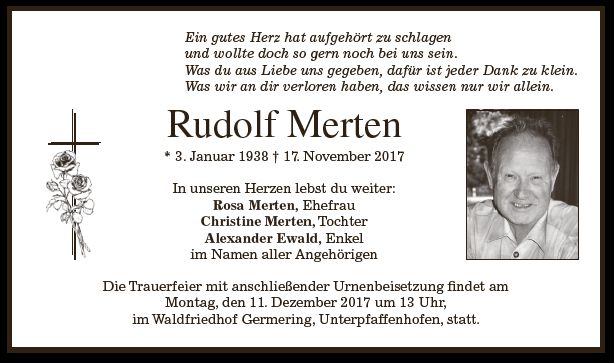 Die Trauerfeier findet am 11. Dezember 2017 um 13 Uhr , im Waldfriedhof Germering, Unterpfaffenhofen, statt. Die Urnenbeisetzung ist im Anschluß
