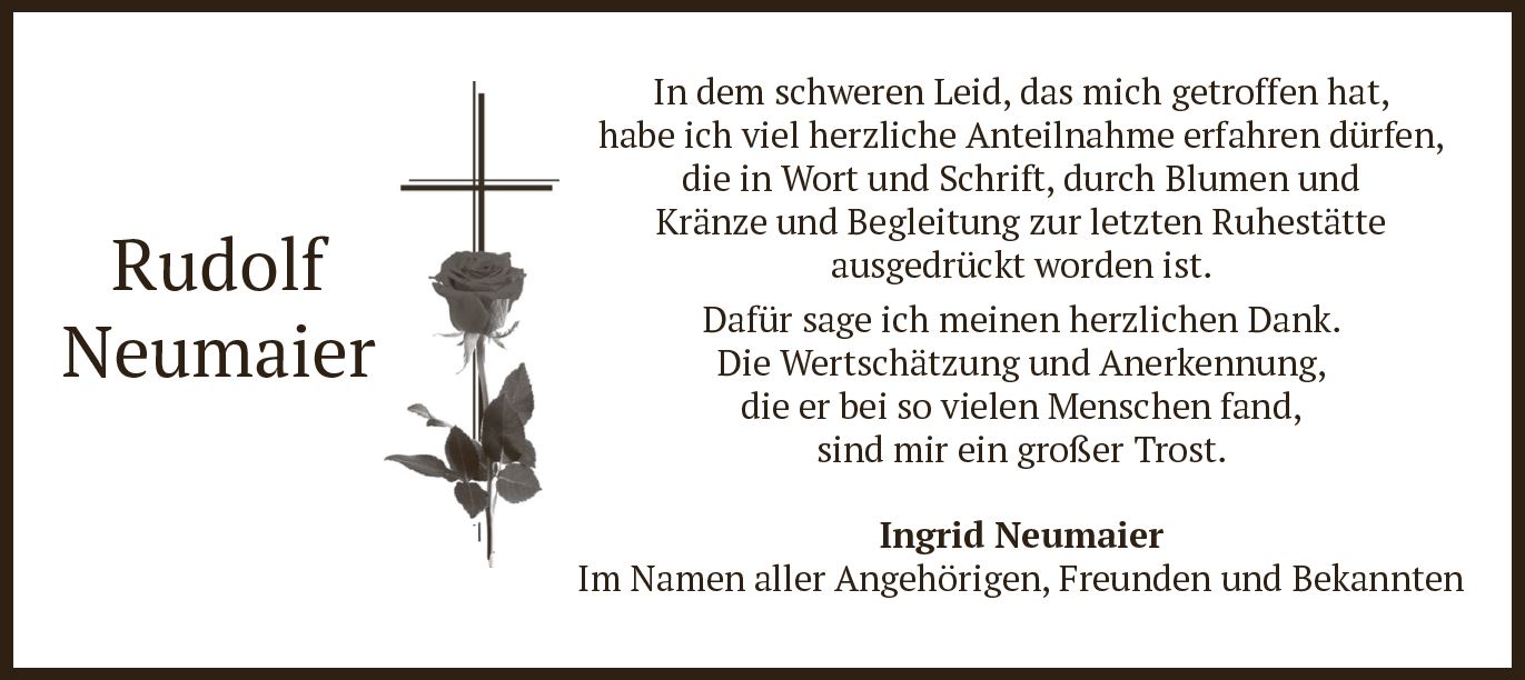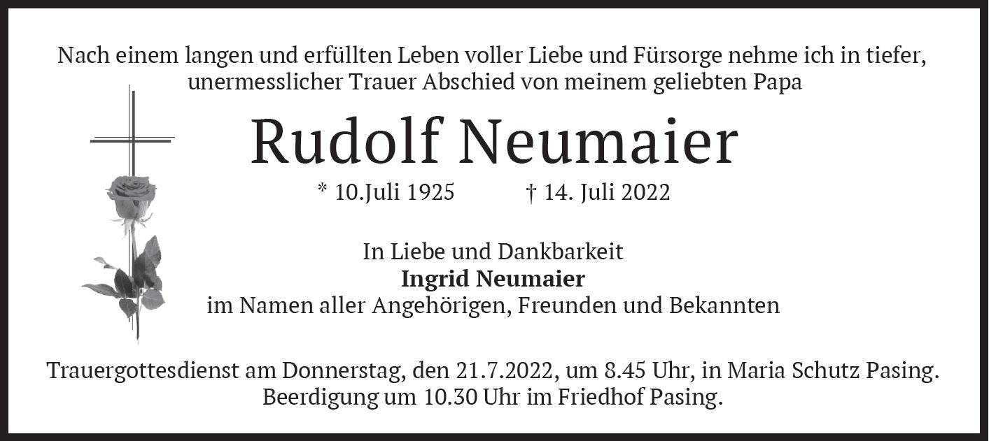 Wir trauern um Herrn Rudolf Neumaier * 10.07.1925 † 14.07.2022 |