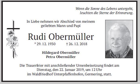 Wir trauern um Herrn Rudolf Obermüller Handelsvertreter * 29.12.1930 † 26.12.2018 |