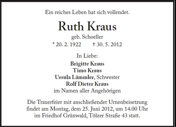 Trauerfeier mit anschließender Urnenbeisetzung am Montag, dem 25. Juni 2012, um 14:00 Uhr im Grünwald.