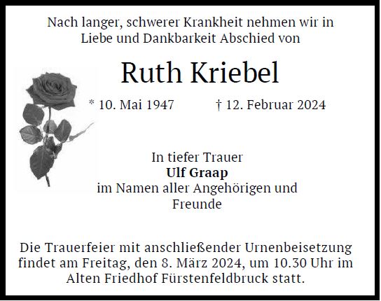 Die Trauerfeier mit anschließender Urnenbeisetzung findet am Freitag, den 8. März 2024, um 10.30 Uhr im Alten Friedhof Fürstenfeldbruck statt. |