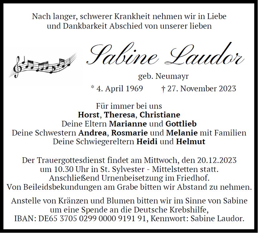 Der Trauergottesdienst findet am Mittwoch, den 20.12.2023 um 10.30 Uhr in St. Sylvester - Mittelstetten statt. Anschließend Urnenbeisetzung im Friedhof. Von Beileidsbekundungen am Grabe bitten wir Abstand zu nehmen. Anstelle von Kränzen und Blumen bitten wir im Sinne von Sabine