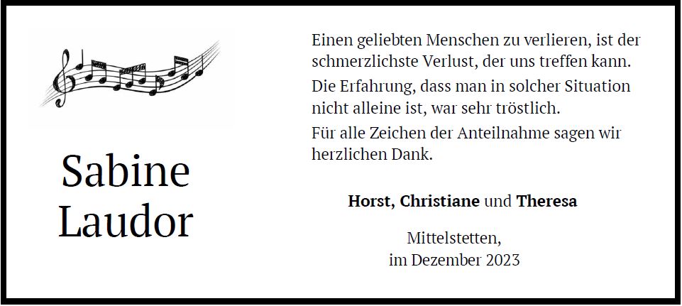 Wir trauern um Frau Sabine Laudor * 04.04.1969 † 27.11.2023 |