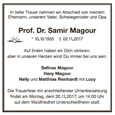 Wir trauern um Herrn Dr. rer. nat. Samir Magour Biochemiker * 10.10.1935 † 02.11.2017 |