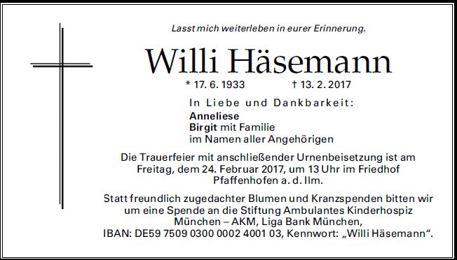 Die Trauerfeier mit anschließender Urnenbeisetzung ist am Freitag, dem 24. Februar 2017 um 13.00 Uhr im Friedhof Pfaffenhofen a. d. Ilm.