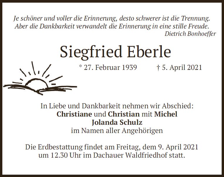 Beerdigung am Freitag, dem 9. April 2021, um 12:30 Uhr im Dachauer Waldfriedhof.