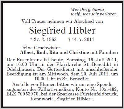 Rosenkranz am Samstag, dem 16.7.2011 um 16:00 in der Pfarrkirche St. Benedikt in Odelzhausen.Gottesdienst mit anschließender Beerdigung am Mittwoch, dem 20.7.2011 um 10:00 Uhr in Odelzhausen. |