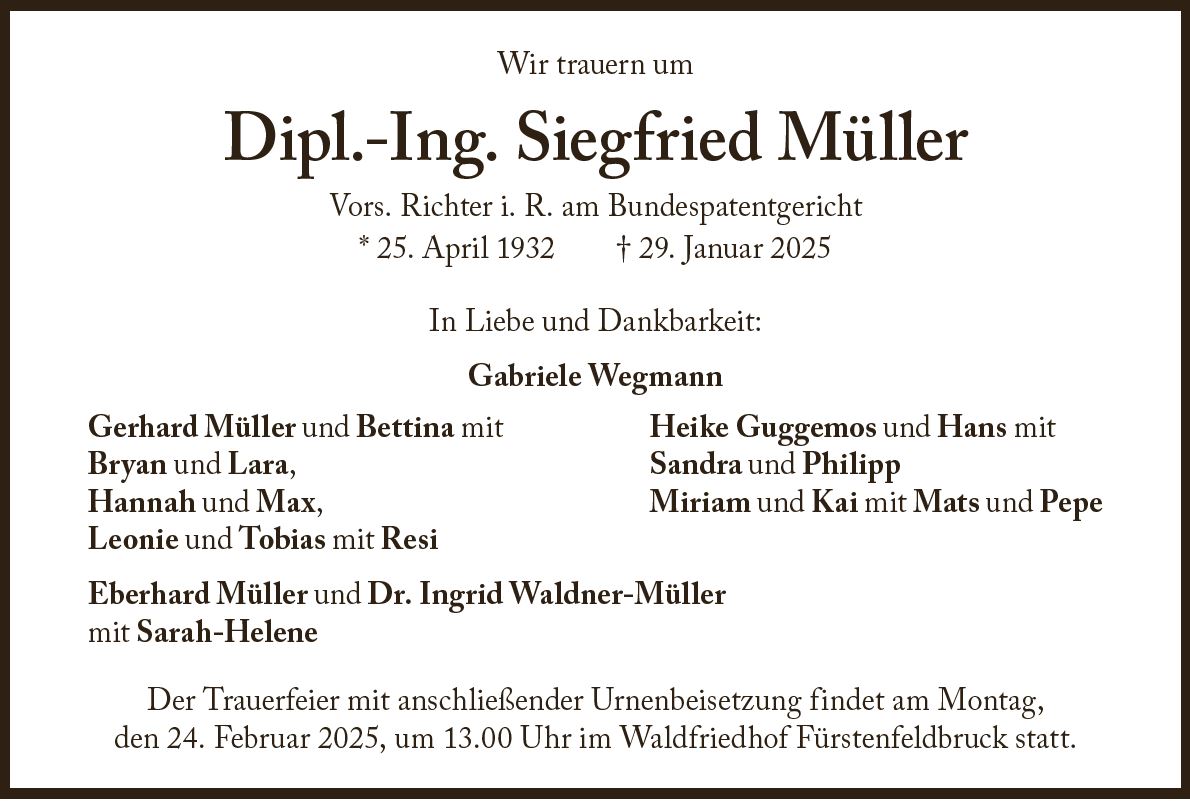 Wir trauern um Herrn Siegfried Müller * 25.04.1932 † 29.01.2025 |