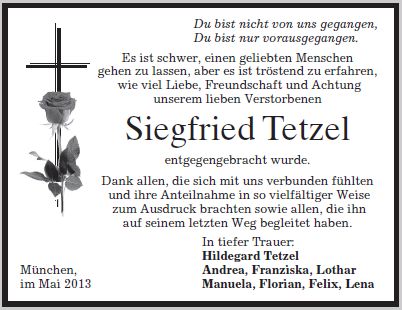 Trauerfeier mit anschließender Beerdigung am Freitag, dem 03.05.2013, um 13:00 Uhr im Waldfriedhof Dachau.