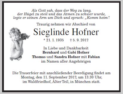 Die Trauerfeier mit anschließender Beerdigung findet am Montag, den 11.9.2017 um 13.30 Uhr, im Waldfriedhof München, Alter Teil, statt. |