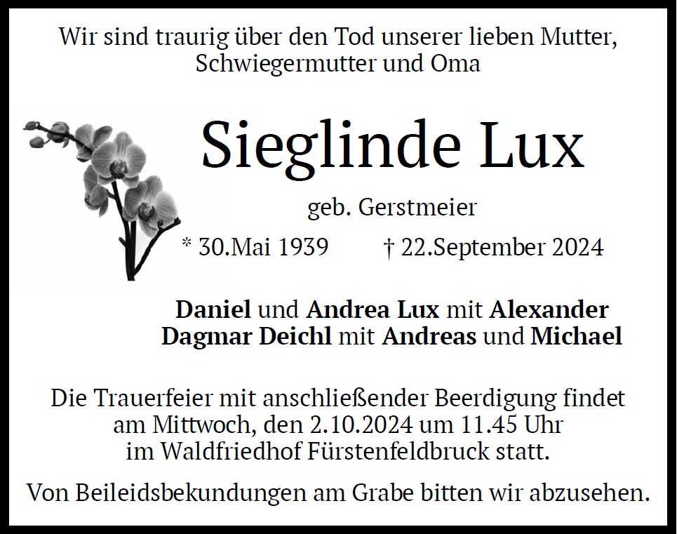 Die Trauerfeier mit anschließender Beerdigung findet am Mittwoch, den 2.10.2024 um 11.45 Uhr im Waldfriedhof Fürstenfeldbruck statt.