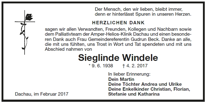 Wir trauern um Frau Sieglinde Windele geb. Katterloher kaufmännische Angestellte * 09.06.1938 † 04.02.2017 |