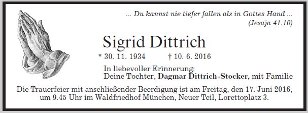 Die Trauerfeier mit anschließender Beerdigung findet am Freitag, den 17. Juni 2016 um 9.45 Uhr im Waldfriedhof München, Neuer Teil, statt. |