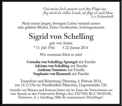 Wir trauern um Frau Sigrid von Schelling geb. von Arnim * 11.07.1916 † 22.01.2014 |