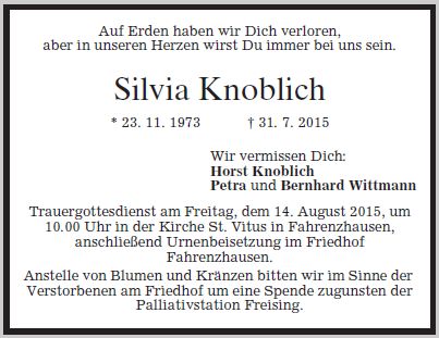 Gottesdienstin am Freitag, dem 14. August 2015 um 10:00 Uhr in St. Vitus in Fahrenzhausen anschließend die Urnenbeisetzung im Gemeindefriedhof in Fahrenzhausen