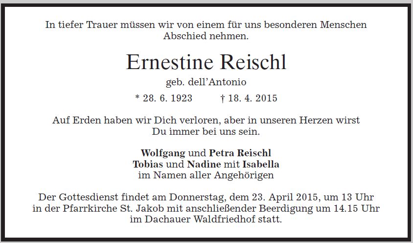 Der Trauergottesdienst ist am Montag, dem 4. Mai 2015, um 10 Uhr in Vierkirchen. Die Urnenbeisetzung ist anschließend im Friedhof Vierkirchen, gemeindlicher Teil.