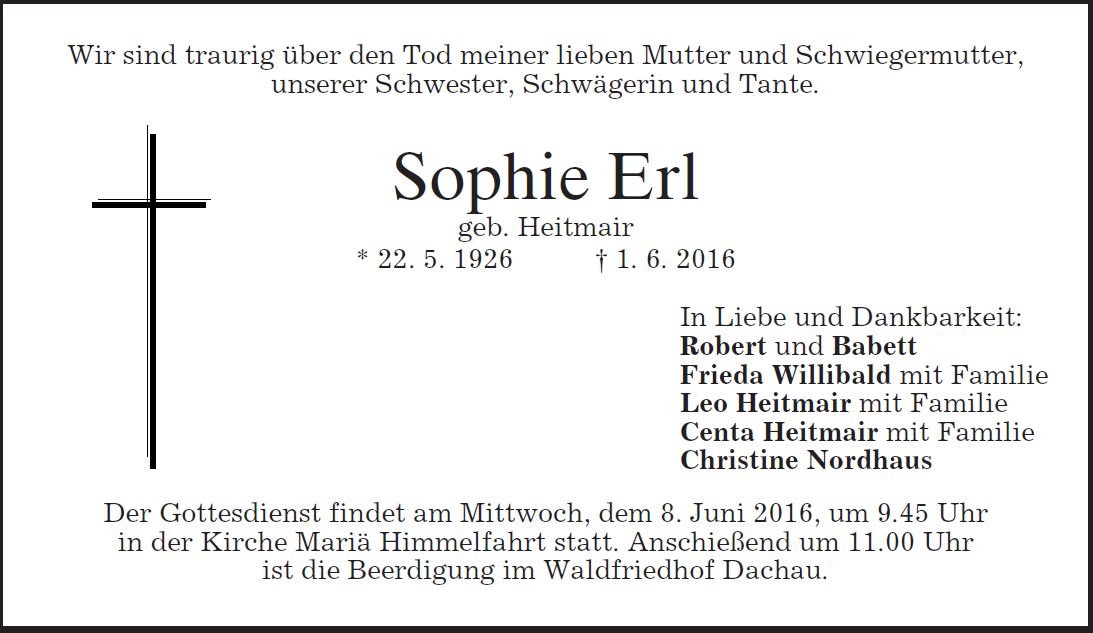 Gottesdienst am Mittwoch, dem 8. Juni 2016, um 09:45 Uhr in Mariä Himmelfahrt Beerdigung am Mittwoch, dem 8. Juni 2016, um 11:00 Uhr im Dachauer Waldfriedhof