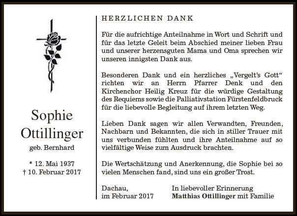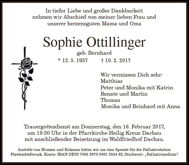 Wir trauern um Frau Sophie Ottillinger geb. Bernhard * 12.05.1937 † 10.02.2017 |