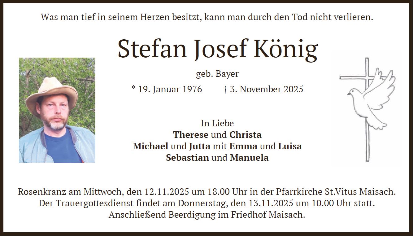 Wir trauern um Herrn Stefan König geb. Bayer * 19.01.1976 † 03.11.2025 |