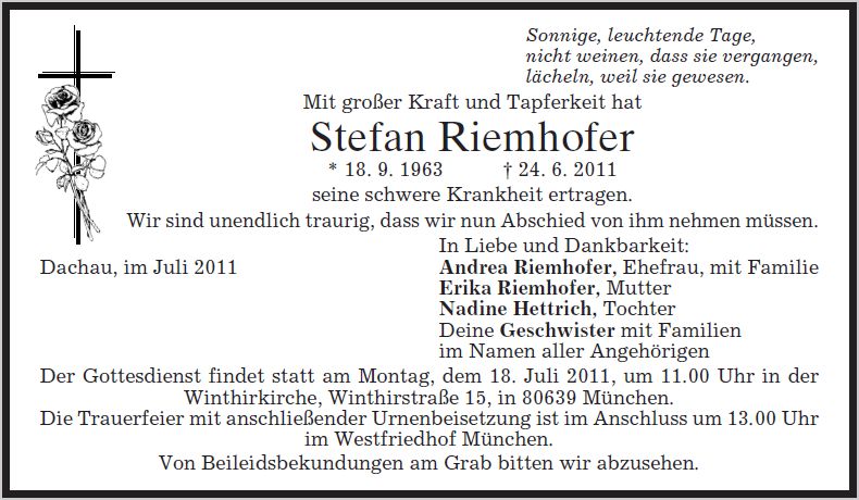 Wir trauern um Herrn Stefan Riemhofer Versicherungskaufmann * 18.09.1963 † 24.06.2011 |