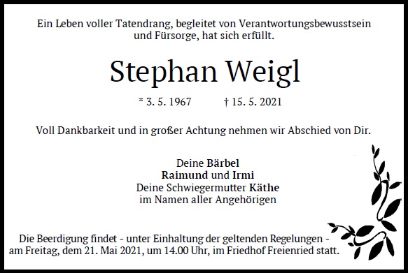 Wir trauern um Herrn Stephan Weigl Angestellter * 03.05.1967 † 15.05.2021 |