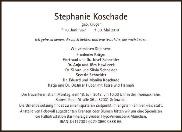 Wir trauern um Frau Stephanie Koschade geb. Krüger Kinderkrankenschwester * 10.06.1967 † 30.05.2018 |