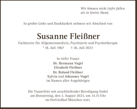 Wir trauern um Frau Susanne Fleißner Fachärztin für Allgemeinmedizin, Psychiatrie und Psychotherapie * 18.07.1967 † 26.07.2023 |