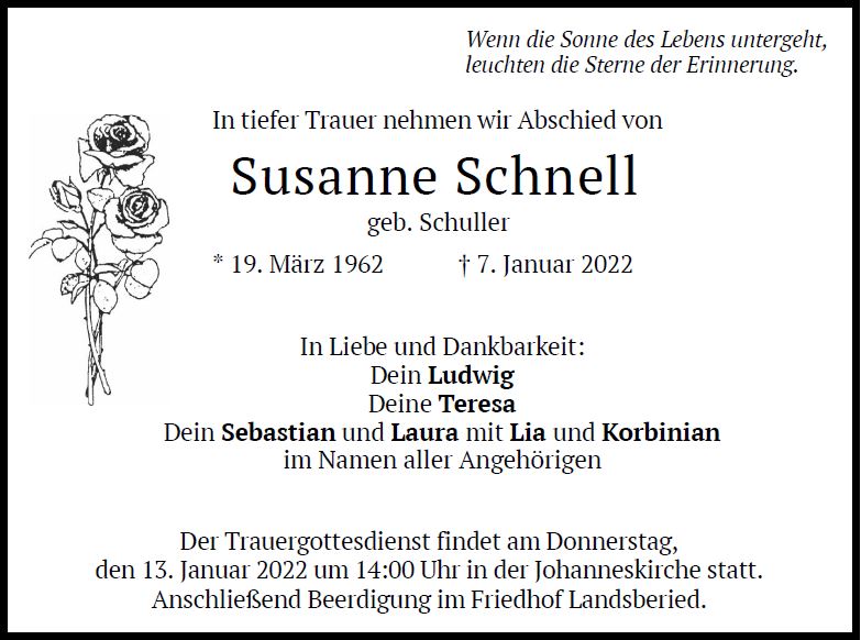 Wir trauern um Frau Susanne Schnell geb. Schuller * 19.03.1962 † 07.01.2022 |