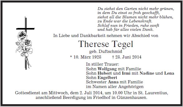 Gottesdienst am Mittwoch, dem 2. Juli 2014, um 10:00 Uhr in St. Laurentius iin Günzenhausen Beerdigung am Mittwoch, dem 2. Juli 2014, um 11:00 Uhr im Friedhof Günzenhausen
