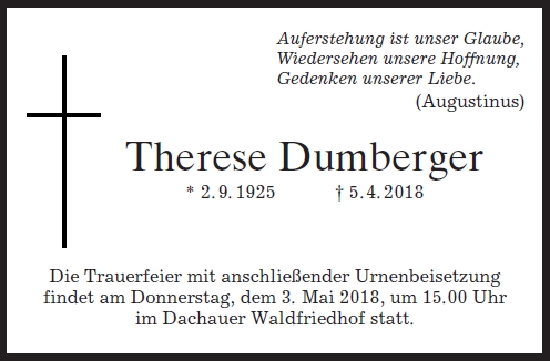 Trauerfeier mit anschließender Urnenbeisetzung am Donnerstag, dem 3. Mai 2018, um 15:00 Uhr im Dachauer Waldfriedhof.