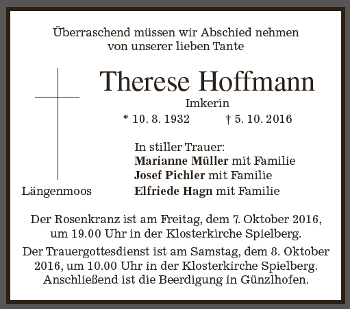 Wir trauern um Frau Therese Hoffmann Imkerin * 10.08.1932 † 05.10.2016 |