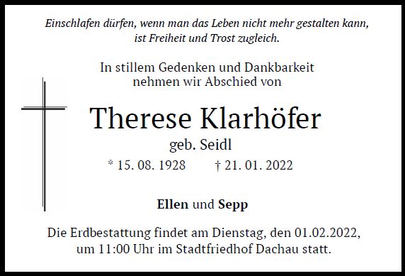 Beerdigung am Dienstag, dem 1. Februar 2022, um 11:00 Uhr im Dachauer Stadtfriedhof.