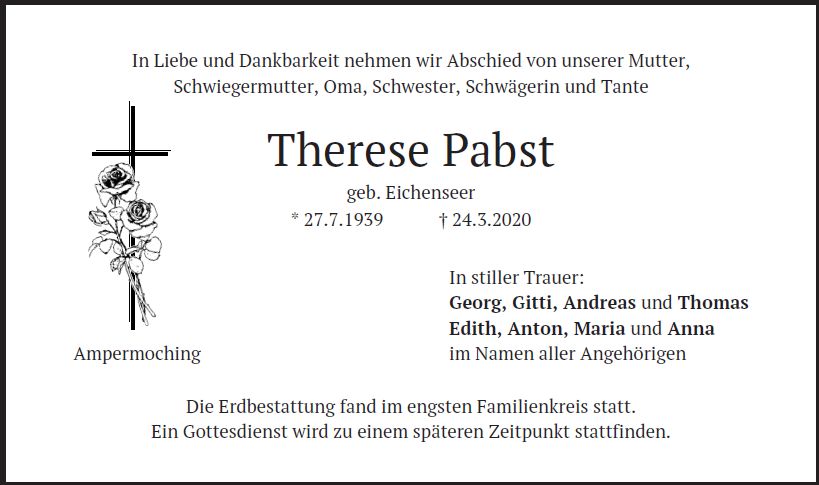 Die Erdbestattung fand im engsten Familienkreis statt. Ein Gottesdienst wird zu einem späteren Zeitpunkt nachgeholt.