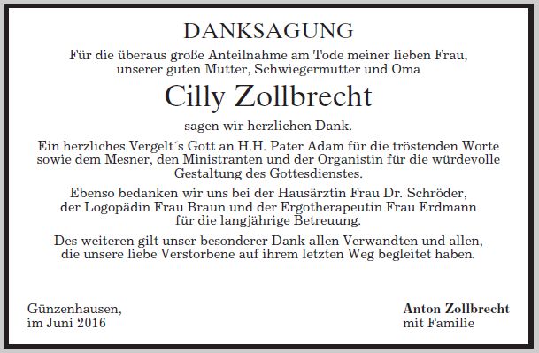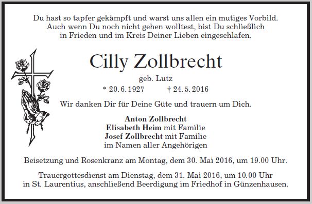 Beisetzung und Rosenkranz am Montag, dem 30.05.2016 um 19:00 Uhr in Günzenhausen. Trauergottesdienst mit anschließender Beerdigung am Dienstag, dem 31. Mai 2016, um 10:00 Uhr im Günzenhausen