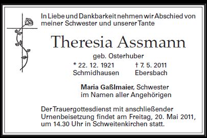 Gottesdienst mit anschließender Urnenbeisetzung am Freitag, dem 20. Mai 2011, um 14:30 Uhr in Schweitenkirchen