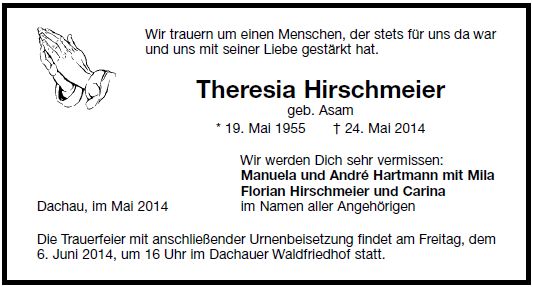 Wir trauern um Frau Theresia Hirschmeier geb. Asam Postangestellte * 19.05.1955 † 24.05.2014 |