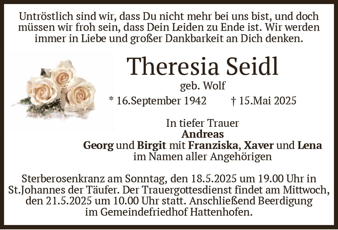 Wir trauern um Frau Theresia Seidl geb. Wolf * 16.09.1942 † 15.05.2025 |
