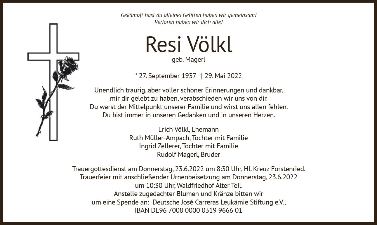 Wir trauern um Frau Theresia Völkl geb. Magerl Köchin * 27.09.1937 † 29.05.2022 |