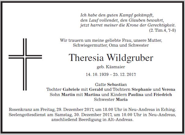 Wir trauern um Frau Theresia Wildgruber geb. Käsmaier Hausfrau * 14.10.1939 † 25.12.2017 |