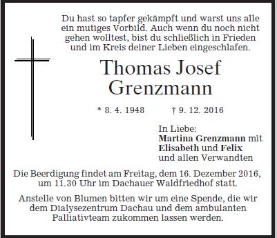 Beerdigung am Freitag, dem 16. Dezember 2016, um 11:30 Uhr im Dachauer Waldfriedhof.